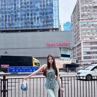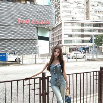 牛仔套装是真的好看,抹胸上衣+紧身微喇牛仔裤,上衣的荷叶边设计不但有