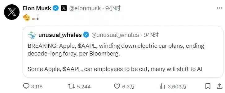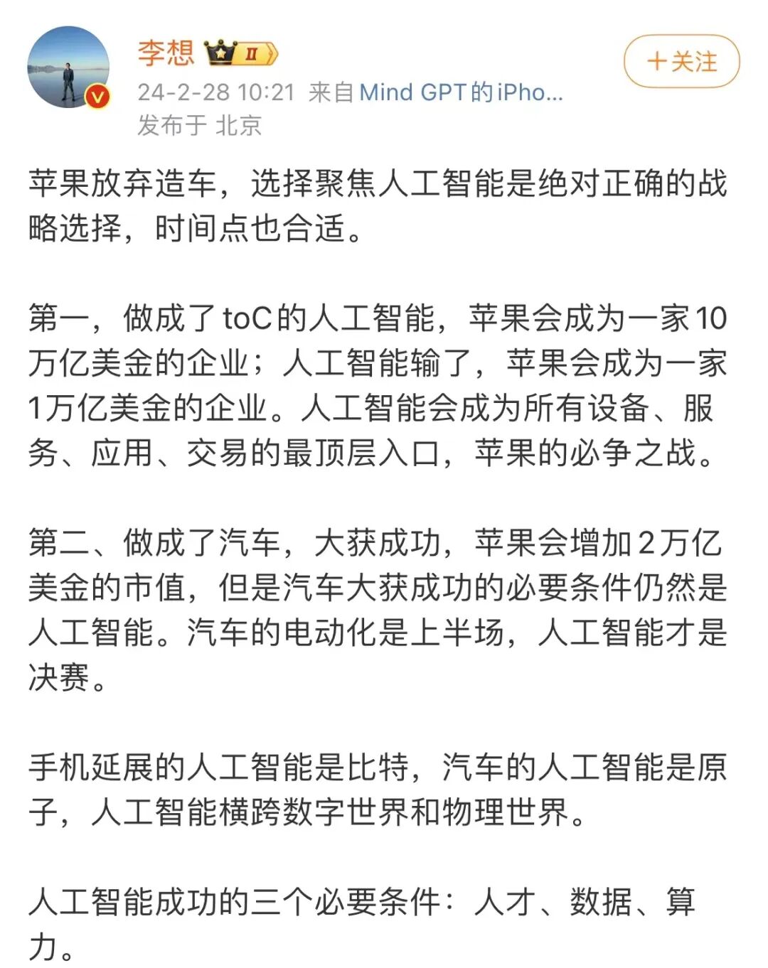 随后,特斯拉投资人Sawyer Merritt发帖分析了苹果放弃造车的原因,并表示美国只有两家车企从未破产过,一家是福特,另一家是特斯拉。马斯克对此回复说,“破产是一家车企的常态”。“苹果取消造车”的消息曝出后,中国的新势力车圈大佬也纷纷在社交平台发表看法。理想汽车CEO李想表示,苹果放弃造车,选择聚焦人工智能是绝对正确的战略选择,时间点也合适。