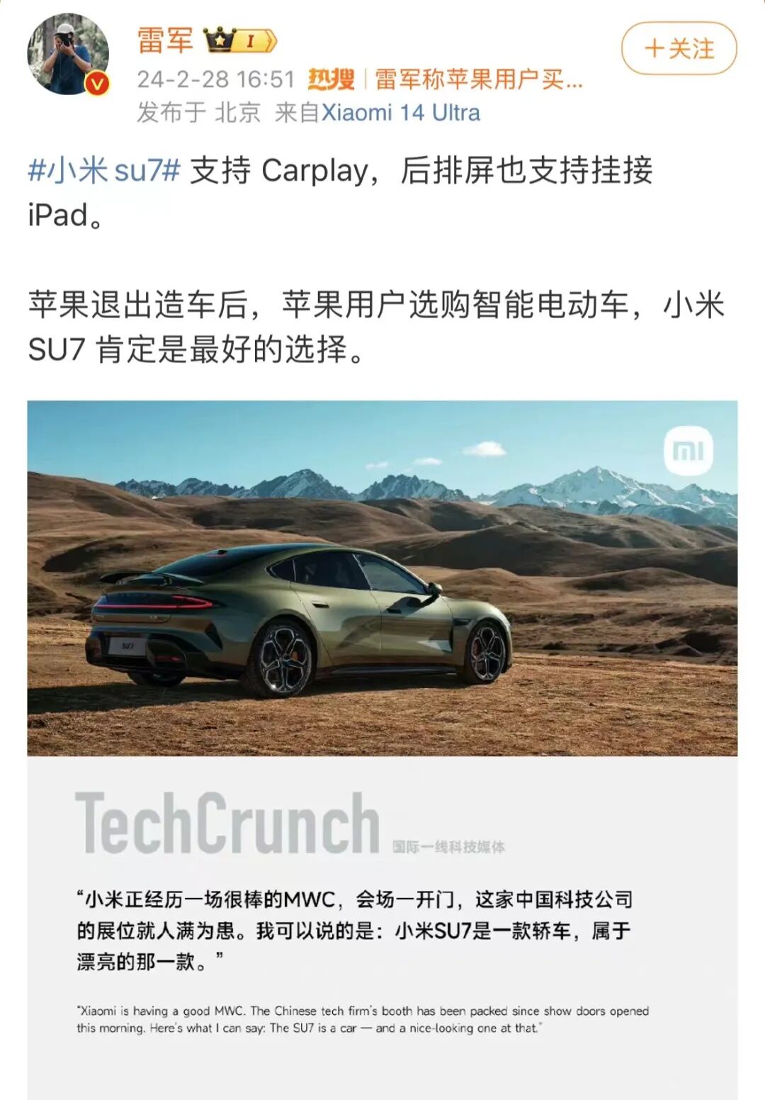 当日下午,雷军再次发微博称:“小米SU7支持Carplay,后排屏也支持挂接iPad。苹果退出造车后,苹果用户选购智能电动车,小米SU7肯定是最好的选择。”