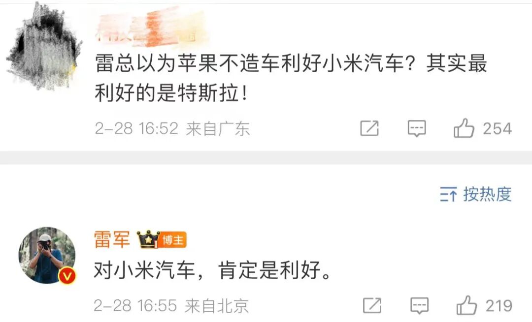 有意思的是,在雷军的微博下也有网友留言“雷总以为苹果不造车利好小米汽车?其实最利好的是特斯拉”。对此,雷军回复称“对小米汽车,肯定是利好”。
