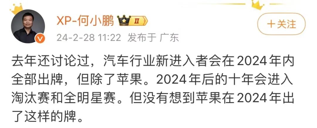 小鹏汽车CEO何小鹏则发帖表达了意外之感,“去年还讨论过,汽车行业新进入者会在2024年内全部出牌,但除了苹果。2024年后的十年会进入淘汰赛和全明星赛。但没有想到苹果在2024年出了这样的牌。”