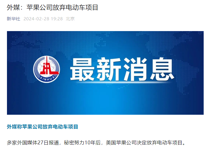 2月28日,“苹果被曝取消电动车项目”一事刷屏汽车圈。有媒体援引知情人士表示,苹果公司取消了长达十年的电动汽车计划。